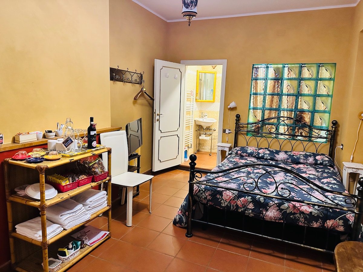 SUITE MATRIMONIALE VASARI IN VILLA SARGIANO - 25 mq - max 2 Ospiti - bagno con vasca idromassaggio - letto matrimoniale alla francese (200x150). Smart TV. La cucina è in comune con altre 2 camere ed è completa di delicatezze dolci e salate in OMAGGIO di benvenuto, angolo cottura con forno tradizionale, microonde con grill, piatti, bicchieri, posate, pentole, bollitore, macchine da caffè, frigorifero, lavatrice e TV. All'esterno disponibile Barbeque. CIN: IT051002C2JHO8YORE – CIR: 051002LTN1163