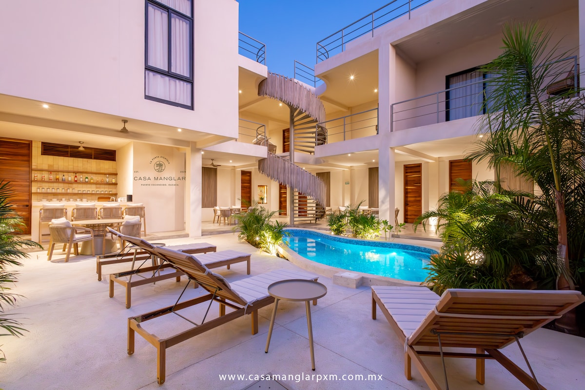 Esta suite junto a la piscina cuenta con una cama tamaño queen y baño privado. Tiene acceso compartido a 2 cocinas totalmente equipadas, una ubicada junto a la piscina y la otra en el tercer piso del hotel. Proporcionamos lo básico: agua potable, jabón de manos, papel higiénico, toallas de baño frescas y toallas de playa. Extras: plancha, nevera de playa, sombrilla y mucho más. Aire acondicionado disponible por un cargo adicional. Internet Starlink. ¡Mira mi código QR para acceder a nuestra guía! Encontrarás mucha información sobre Puerto Escondido y nuestra zona.