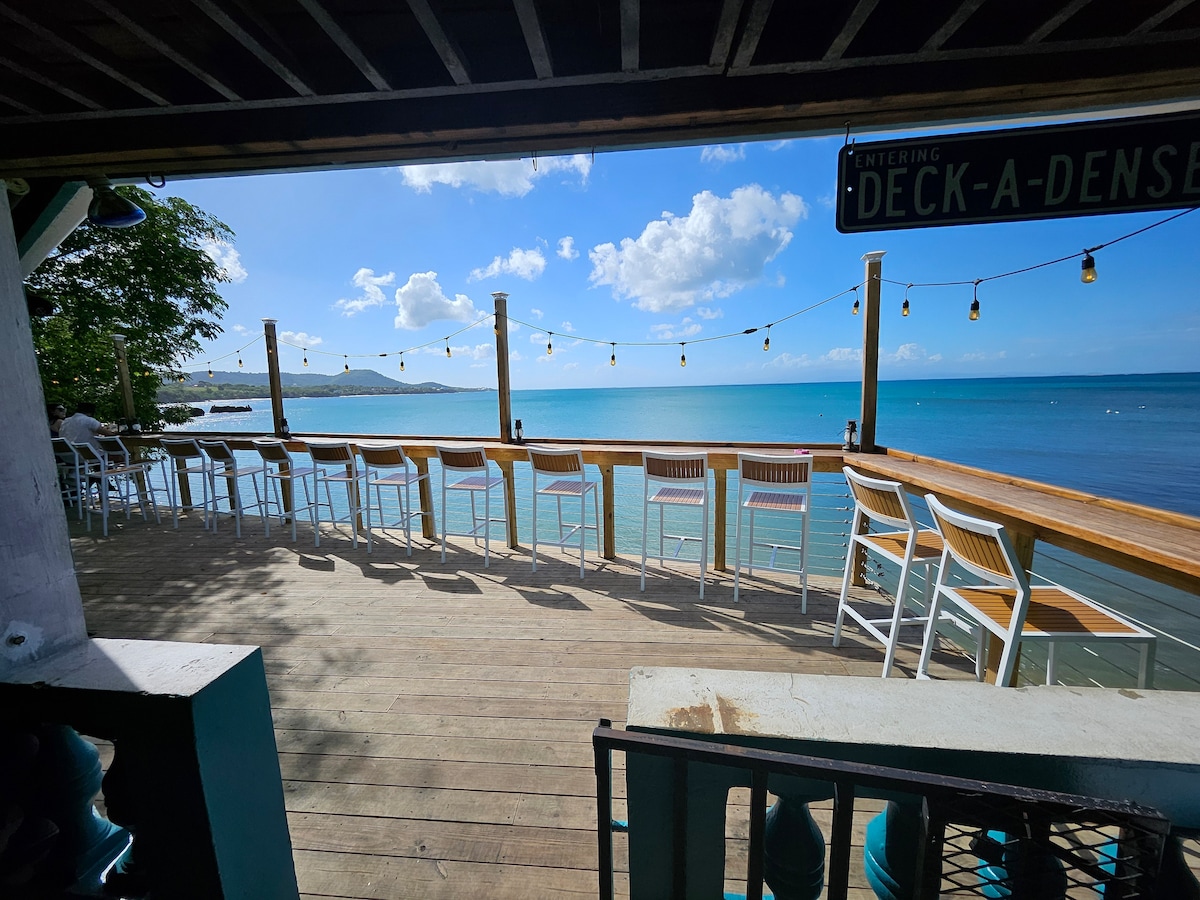 Disfruta del apartamento privado de la planta baja en nuestra casa de dos pisos. Cuenta con una cocina abierta completa, comedores interiores y exteriores, una cama tamaño queen en el dormitorio con aire acondicionado, un sofá que se convierte en una segunda cama y una ducha con agua caliente. Hay televisión inteligente. La entrada es privada y el estacionamiento está justo delante del apartamento. Se encuentra en Villa Borinquen, a 5 minutos en coche o a 25 minutos a pie de la estación de transbordadores y de las zonas de surf.