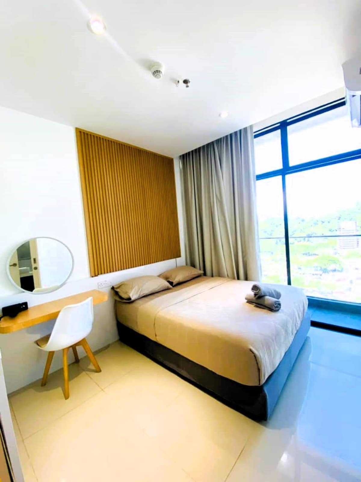 Stunning Sea view from the house. Chilling at the balcony. Swimming pool@level 6 Living Room, Queen Size bedroom, private sofa bed corner with curtains. Ensuite bathroom with hot and cold water shower. Large refrigerator with ice cube , mini kitchen with electric cooker, pot,plate,spoon,fork are available . Light cook at the kitchen. Filter water machine hot and warm. Please select 3 guest if you need single bed setting convert from sofa bed.
