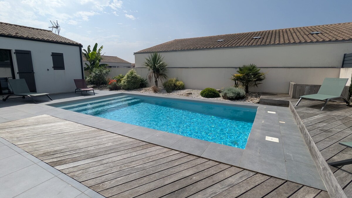 Sur Vendée, hermosa contemporánea con piscina interior de sal, en el corazón del pantano de Poitevin a 20 minutos de las playas de La Faute sur mer, l 'Aiguillon sur mer, a 30 minutos de la Isla de Ré y La Rochelle. 3 habitaciones, jardín de 1500 m ², terraza cubierta, muebles de jardín, plancha. Algunas brazas en agua de sal a 29 grados, muy cerca de la sala de estar, con vistas al jardín, natación a contracorriente ,jacuzzi integrado en la piscina . Laurence y Bruno le dan la bienvenida en su agradable piso elegante y cómodo.