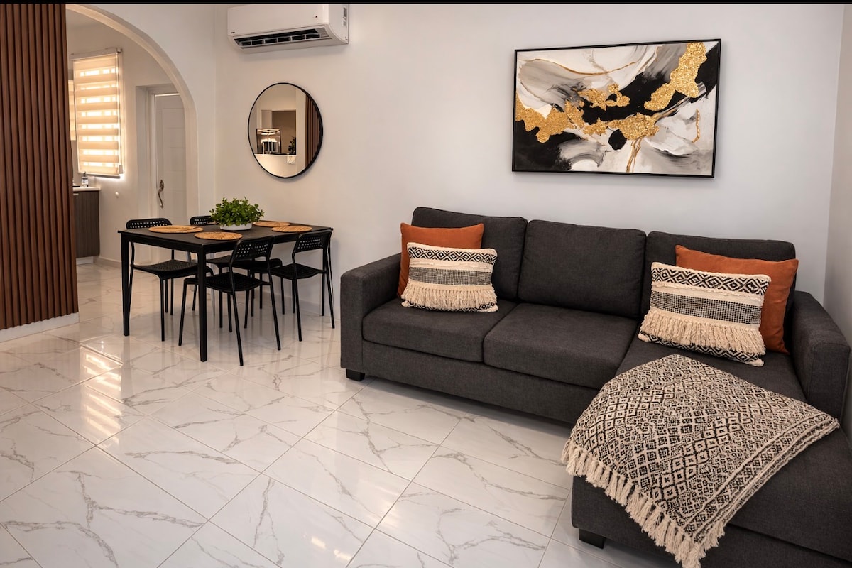 Precioso Apartamento para 2 personas totalmente independiente (son 5 en total) TENEMOS PANELES SOLARES, con entrada independiente, cada 1 con dormitorio, baño, cocina, estufa , microondas, lavadora, secadora, aire acondicionado en la habitación , wifi, parking privado decorado con murales, patio con proyector y Bbq, roku Tv y netflix. Cerca de todo¡ Supermercados ,Hospital , Farmacias, a minutos de la playa Seven Seas