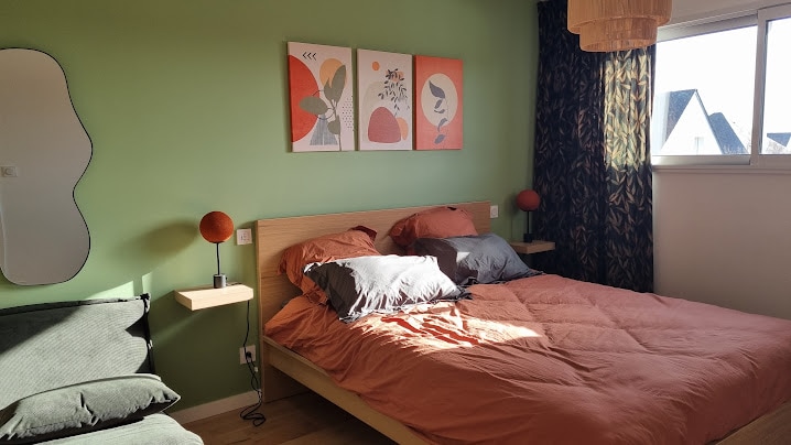 “Belles de Bretagne” offers you a 33 m2 studio on the 2nd floor with elevator. Comfortable furnishings: living/dining room with a FOLDABLE bed (1 x 160 cm, long 200 cm), TV. Kitchen (dishwasher, electric hob, fridge) electric kettle, electric coffee maker, espresso machine). Shower/WC. Washing machine. Balcony. Beautiful sea view. Parking space. Bed and bathroom linen extra. The cleaning will be done by you. Don't forget to add to your reservation if you are coming with your pet.