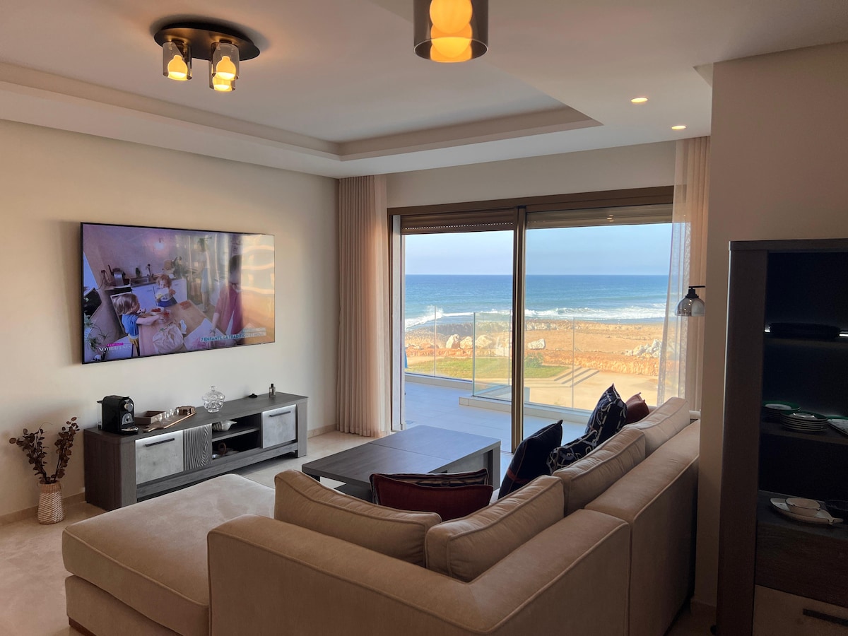 Situado en Sidi Bouknadel, este apartamento en la Playa de las Naciones ofrece alojamiento con impresionantes vistas del océano Atlántico. Este piso tiene: - 2 dormitorios, uno de ellos frente al mar - Cocina equipada - Salón con terraza frente al mar - Piscina segura - En la parte inferior de la residencia: pizzería; heladería;bar; supermercado y clases de surf - Golf de 18 hoyos a 5 minutos a pie - Una plaza de garaje segura también disponible - La residencia se mantiene las 24 horas del día