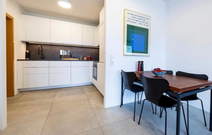 Situado en una zona tranquila del balneario de Radolfzell, con su idílico casco antiguo, el apartamento vacacional "Mettnau" de 48 m² se encuentra en la planta baja de una casa residencial moderna y equipada de alta calidad y tiene su propia entrada. El apartamento de estilo Bauhaus dispone de un amplio salón/dormitorio con un sofá, una cama queen-size y una zona de comedor con una cocina bien equipada que incluye un lavavajillas.