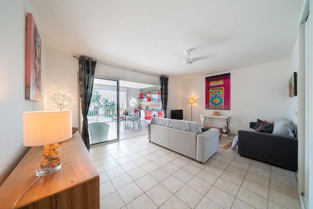 🌴 Exceptional beachfront apartment – Sea view & direct access to Raisins Clairs Beach On the 1st and top floor of a secure upscale residence, with shops and restaurants within walking distance Renovated and air-conditioned: 2 bedrooms with storage, modern shower room, separate toilet, fully equipped kitchen (washer, dishwasher, large refrigerator + freezer, Nespresso & Senseo) Spacious balcony with sea and pool views, equipped with a plancha. Private Wi-Fi, TV, parking, 300-L private water tank