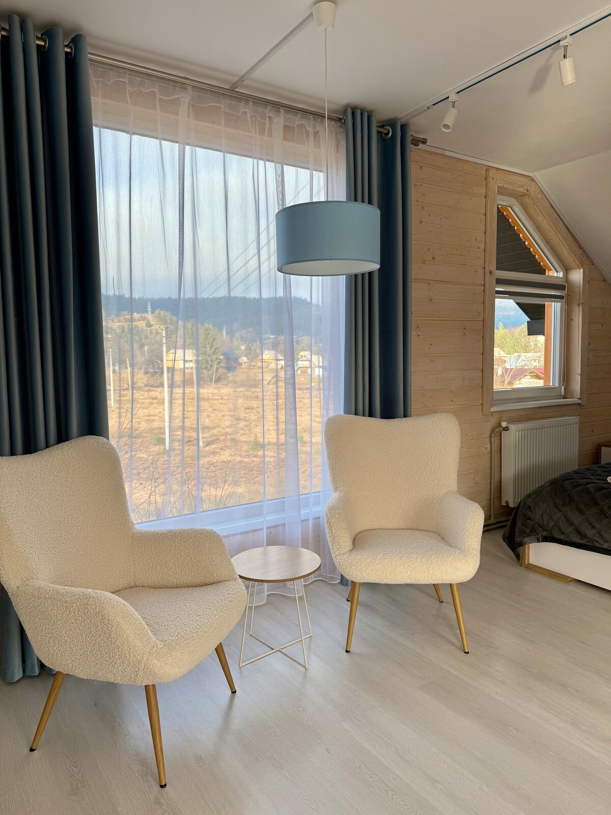 Perfecto para unas vacaciones familiares con niños. Primer piso: vestíbulo de entrada, cocina y baño con tina; 2 .ª planta: dos habitaciones. Nueva renovación. Electrodomésticos: nevera, lavadora, estufa eléctrica, microondas, hervidor, cafetera, televisores, secador de pelo, wifi. Cerca hay toda la infraestructura necesaria: estación de autobuses y trenes, establecimientos de alimentos, comercios, farmacias. La distancia a Dragobrat es de 32 km, de Bukovel a 50 km, a los lagos salados de Solotvyno a 48 km.