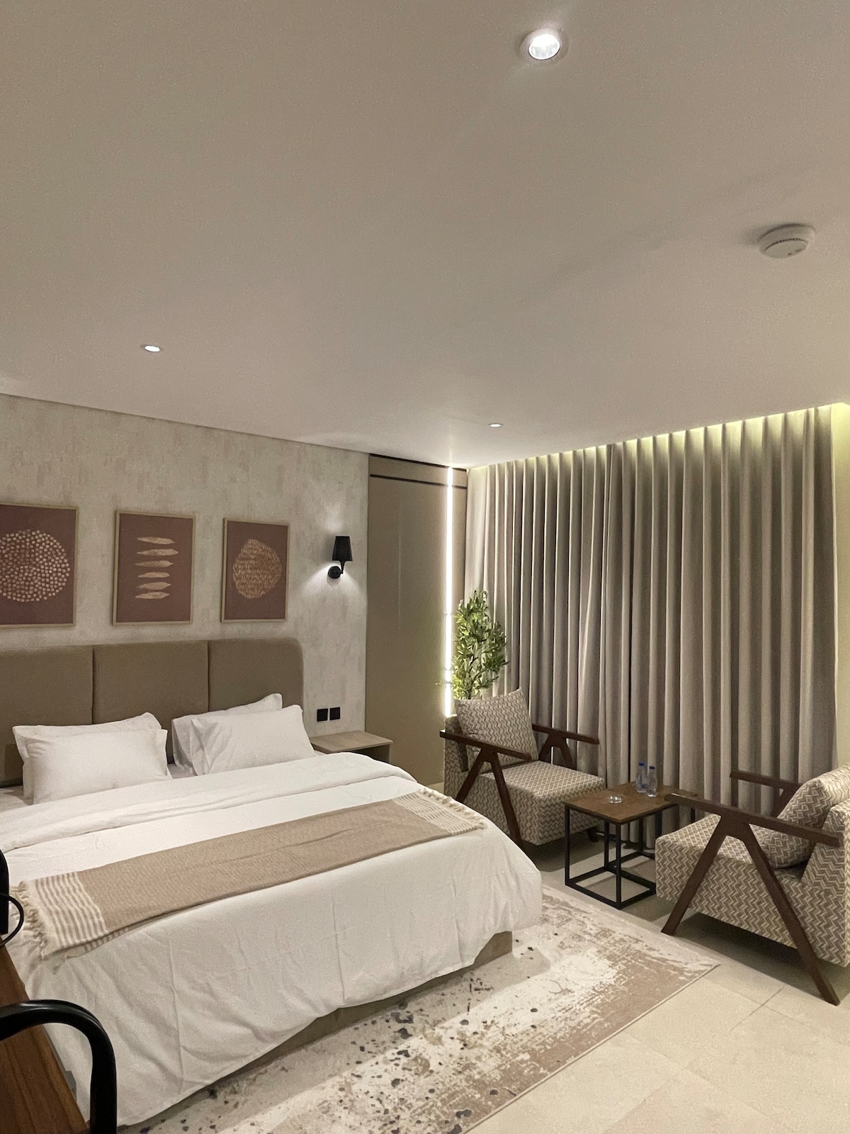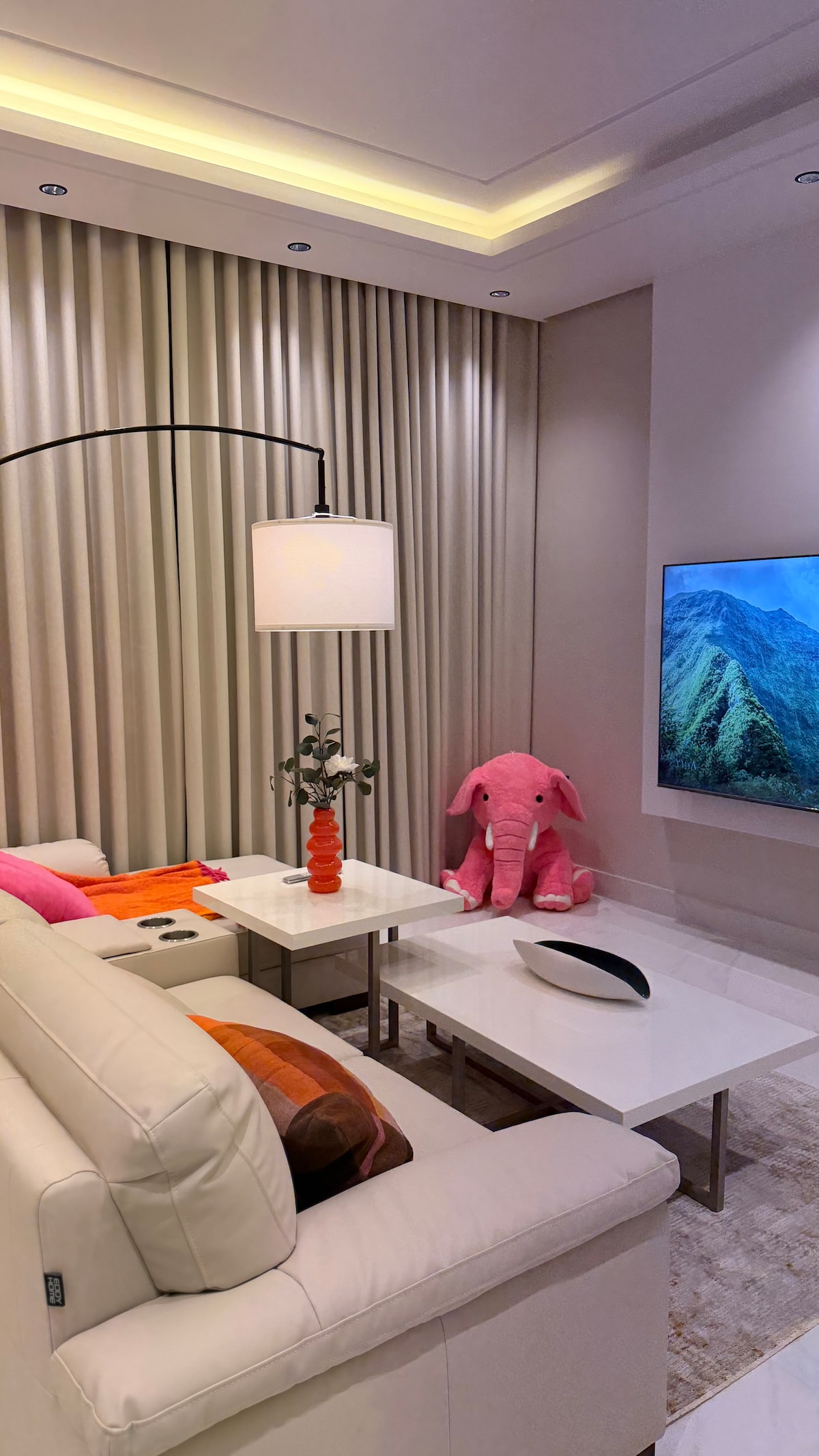 🧡 🦩Suite Naranja | Al Ajaweed Tu destino tranquilo en medio de detalles elegantes y toques cómodos, disfruta de una estancia que vibra con comodidad y belleza, donde la decoración y el ambiente tranquilo se unen para darte una sensación inmediata de relajación desde el momento en que entras y te sientas en el lujoso sofá cinematográfico con vistas a una pantalla de 65 pulgadas, la suite está equipada con todo lo que necesitas para una experiencia de vida suave y cómoda, con llegada autónoma que te da privacidad y flexibilidad en el acceso cuando lo desees, la ubicación está cerca de la mezquita y la plaza del parque del vecindario, y la calle comercial que contiene todos los servicios 🩷