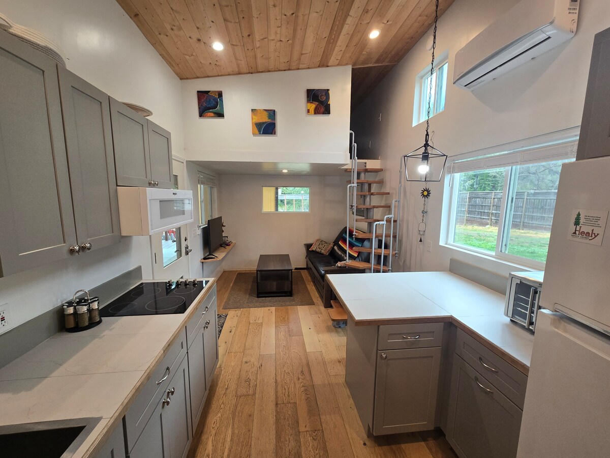 (Price includes 10% bed tax & no cleaning fee!) The "barndominium" tiny house is a cozy, welcoming & unique space just steps away from Ferndale’s restaurants, shops, hiking trails and live music. Our location means you can park the car and walk to all Ferndale has to offer. Enjoy our peaceful creekside half acre and garden atrium. Great stop to explore the redwoods & hiking. Beach, 5 miles. Hosts publish a yearly Ferndale guide.Will send a link when book. Follow us on the 'gram! @ferndaleairbnb.