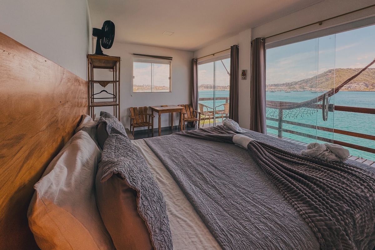 La suite Garda Azul se encuentra en Pontal do Atalaia y tiene vistas al mar y las montañas. Tiene acceso independiente y total privacidad. Baño completo, minibar, armario y balcón con vistas al mar. Decoración clásica, ropa de cama de calidad, baño súper cómodo: todo lo que necesitas para disfrutar de las mejores playas de Arraial do Cabo. No tiene acceso a la terraza ni a la piscina. Un espacio perfecto para relajarse con la familia o amigos.