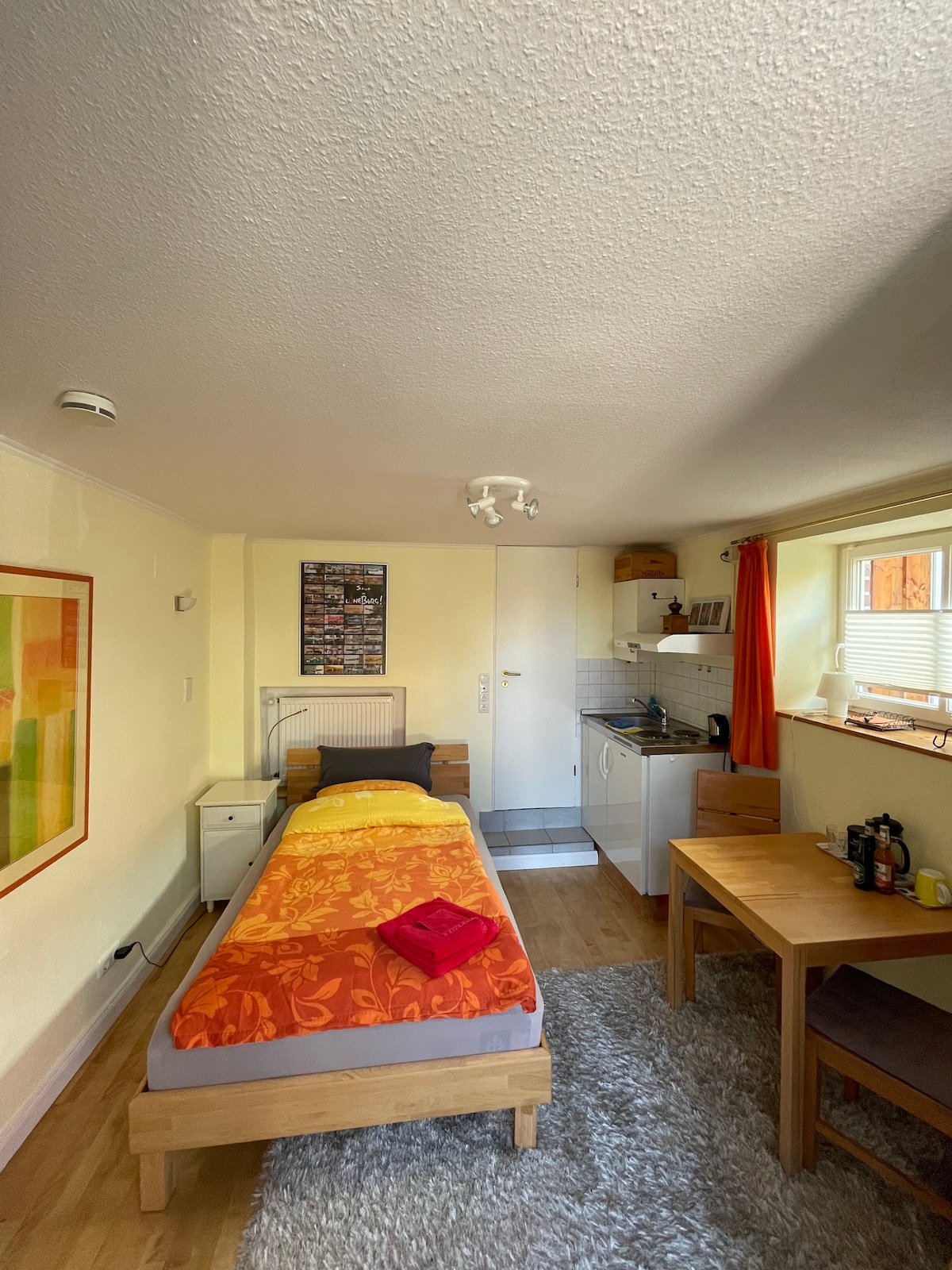 Te damos la bienvenida a nuestro fantástico estudio, un apartamento elegante con un toque especial y mucho amor. Dispondrás de una espaciosa cama de 180 cm, una pequeña cocineta con fregadero, equipada para preparar el desayuno o refrigerios, así como de un baño privado y un balcón. El fantástico estudio es parte de nuestra casa unifamiliar, pero tiene un acceso separado. Puedes estacionar cómodamente en la propiedad.