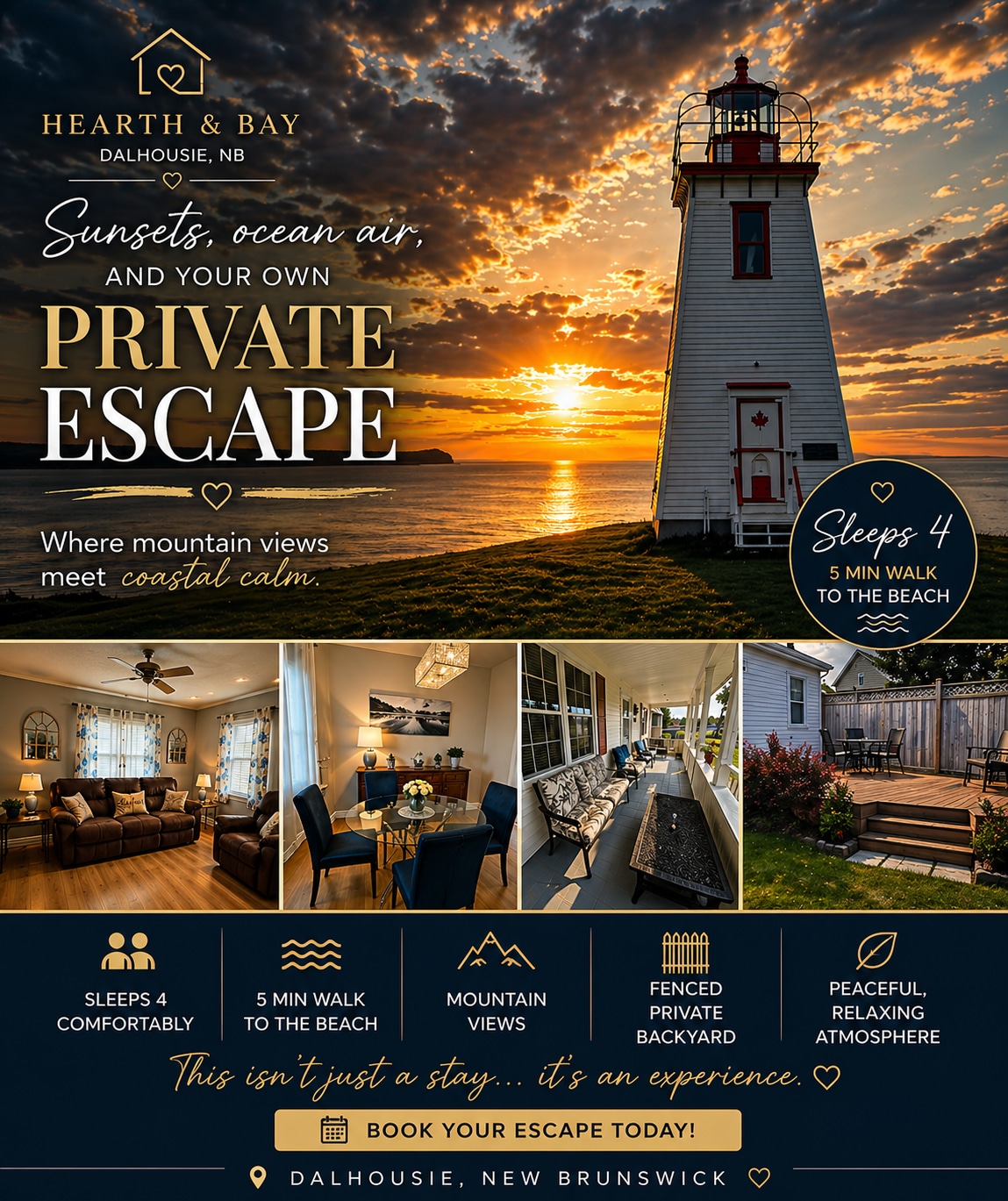 Bienvenido a Cliffside Paradise, tu escapada tranquila junto a la bahía de Chaleur. Esta encantadora casa combina la comodidad de una acogedora cabaña con impresionantes vistas panorámicas, el lugar perfecto para relajarse, descansar y reconectarse. Sal y disfruta del impresionante paisaje durante todo el año desde tu jacuzzi privado o tu auténtica sauna de barril de cedro. Ya sea que estés disfrutando de tu café de la mañana con una vista o relajándote después de un día de aventura, cada momento se siente especial. Perfecto para una escapada romántica o un retiro familiar.