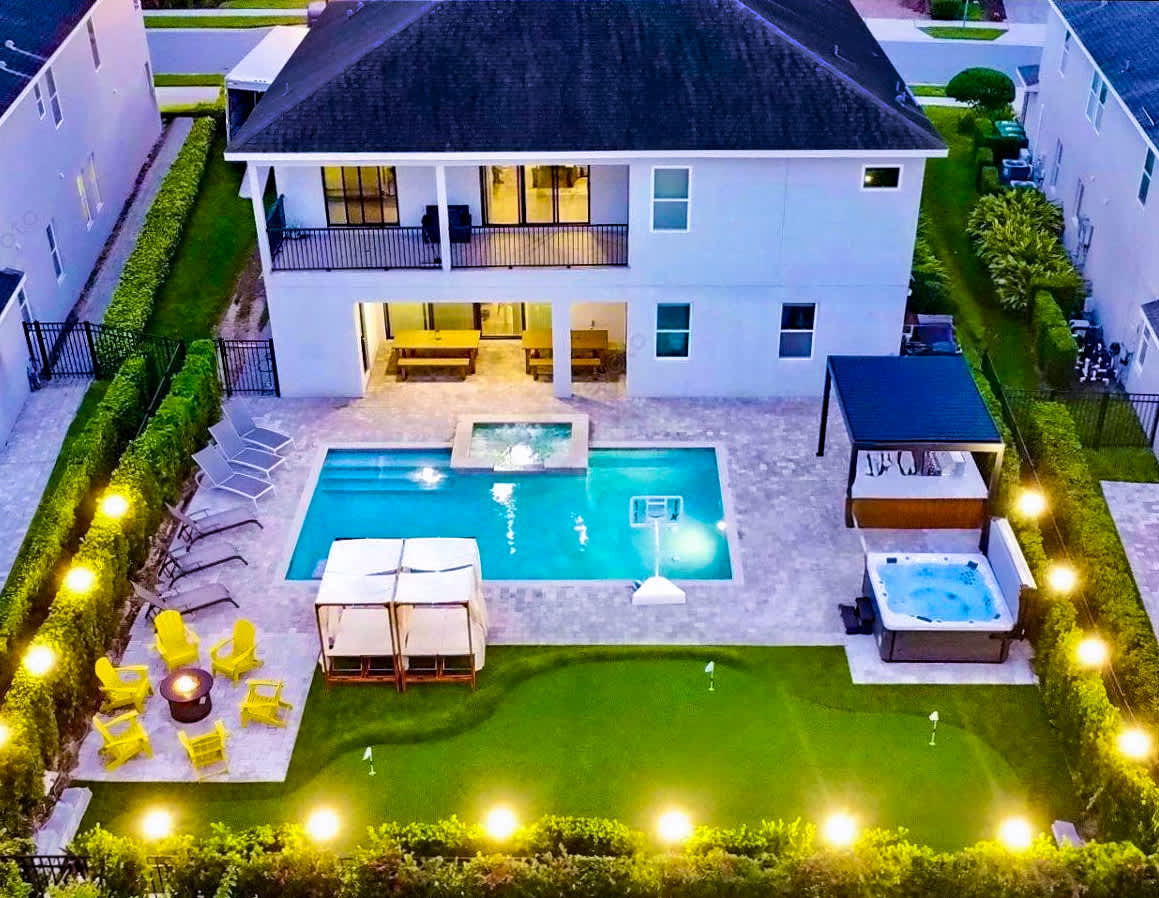 Ubicado en la tranquila comunidad de 4 Corners, cerca de Disney y de las atracciones mejor valoradas, Target, Publix y restaurantes. ¡Recién reformado, acogedor y moderno, de 2 niveles, 5 dormitorios/3,5 baños con cómodas camas de lujo! Equipado con piscina privada (calefacción por un cargo adicional), sala de juegos, parrilla y Nespresso gratuito. En la parte trasera hay un minigolf, un juego de «corn hole» y un pozo de fuego para que la familia se reúna bajo el cálido ambiente de las luces de cuerda. ¡Un lugar para que la familia se retire, se relaje, se recupere y se divierta!