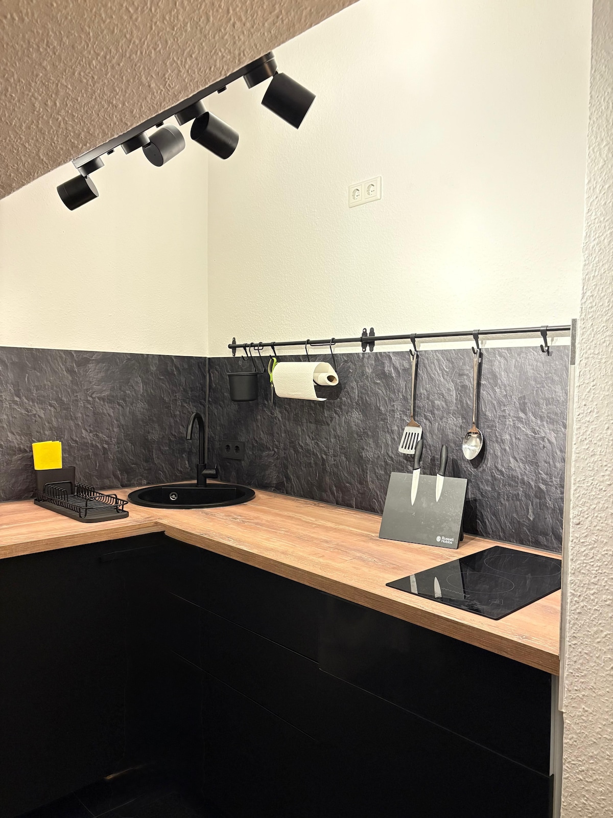 Soleado y exclusivo apartamento de 1 habitación en el centro de Colonia para 1-2 personas; planta abierta, calefacción por suelo radiante, cama cómoda (1,40 x 2 m), elegante sala de estar, cocina, muebles empotrados de alta calidad; diseño de baño moderno con luz natural/mobiliario exclusivo; wifi de alta velocidad de hasta 100 mbit/seg; diseño de iluminación elaborado. A 3 minutos de las calles comerciales, restaurantes y bares en la puerta, a 800 metros de la catedral, autopista A57 en coche en 5 minutos. Reservas de 90 días o más a petición.