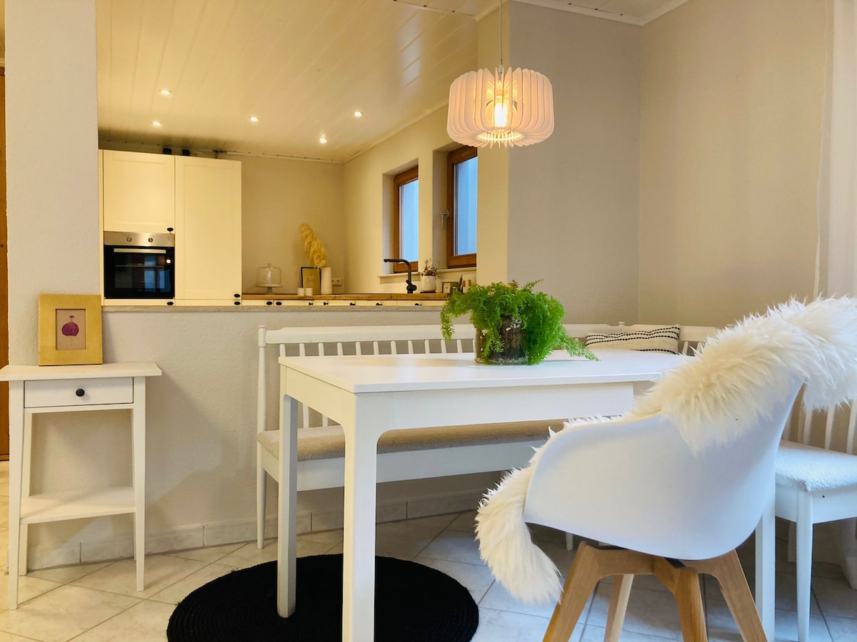 ¡Bienvenido, querido interesado! Te espera un apartamento recién reformado. La pintoresca casa tiene un gran jardín con rincones acogedores para hacer barbacoas, relajarse y descansar. En el jardín se puede utilizar una acogedora sauna con piscina. Los niños pueden y deben disfrutar de su natural impulso de jugar y moverse. Los padres también, por supuesto. Alternativamente, se pueden hacer paseos relajantes o excursiones (por ejemplo, paseos en canoa por el río Lahn). ¡La ciudad universitaria de Gießen está a la vuelta de la esquina!
