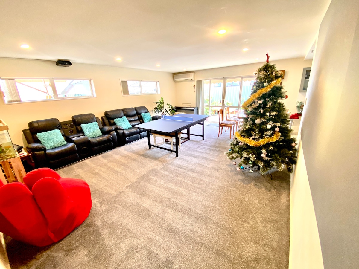Alojamiento de 180 metros cuadrados de 4 dormitorios cerca del CBD Ropa de cama/toallas lavadas profesionalmente Calefacción/aire acondicionado por conductos en cada habitación Estacionamiento gratuito fuera de la calle para 2-3 autos. Muebles de alta gama y ropa de cama cómoda 4 camas tamaño king o 2 camas tamaño king y 4 camas individuales Amplia sala de estar de estilo abierto. Patio privado y piscina de hidromasaje A 15 minutos del aeropuerto CHC A 5 minutos de Christchurch Central City A poca distancia a pie de: centro comercial Westfield, supermercado, restaurante, estación de tren Tranzalpine, estadio Apollo Projects, Wolfbrook Arena y parque Hagley.