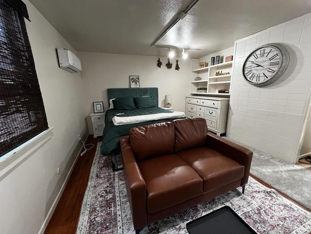 Disfruta de una experiencia elegante en este lugar céntrico. Situada en la hermosa comunidad de Riverside, el tranquilo espacio privado incluye un dormitorio de diseño simplista con baño privado. El estudio tiene una cama tamaño queen muy cómoda y relajante, un televisor (Netflix incluido) y un área de refrigerio elegante que demuestre un microondas, un refrigerador y un Keurig para tu conveniencia.