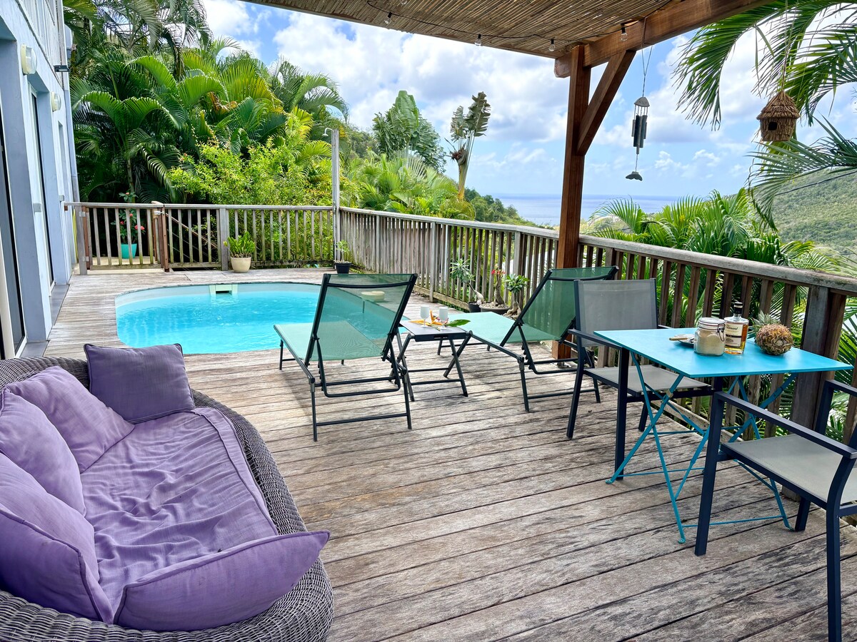 Magnífica villa, situada en las alturas de Sainte Luce, y cerca de la playa Cuenta con 2 dormitorios con aire acondicionado (camas dobles) + vestidores + 2 baños, piscina privada (segura por alarma y barrera) Vista panorámica de 180 grados del mar Caribe y jardín. Ubicado en plena naturaleza, disfrutará del canto de los pájaros y del jardín. No hay roscas. A 5 minutos de la playa y de los servicios (Carrefour express, farmacia, restaurante). Capacidad: 4 personas + 1 bebé