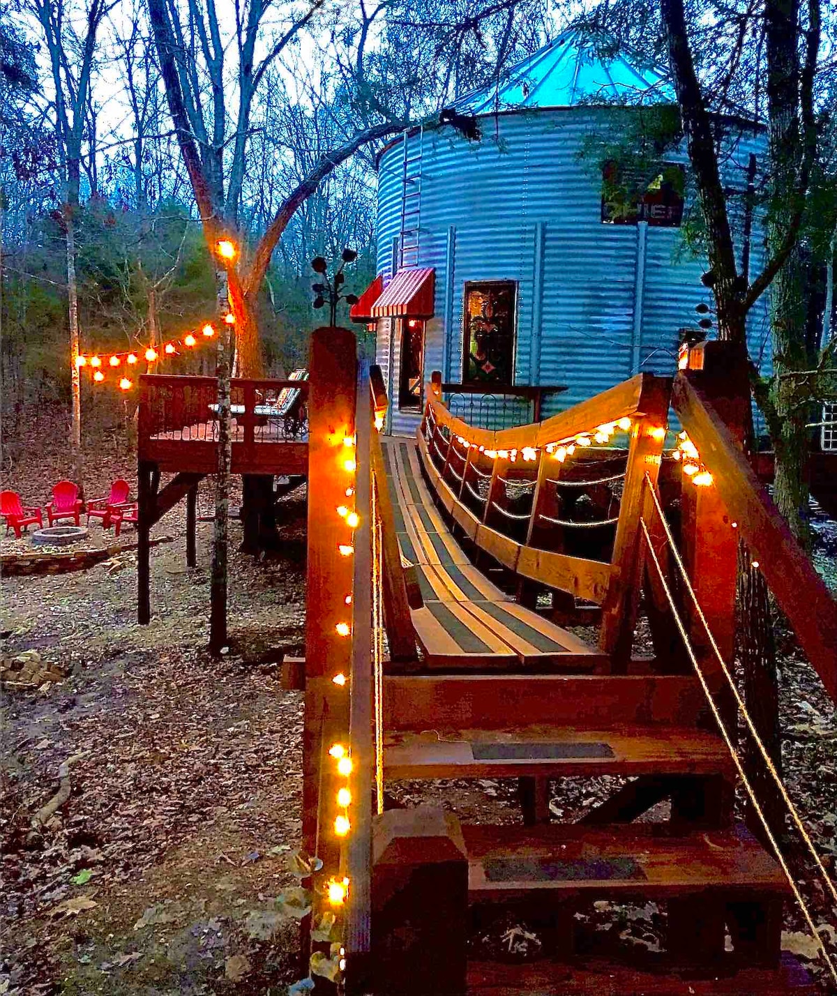 The Sassafrass Silo began life as a grain silo that Mike found on a farm in Kansas. We felt she had more life left in her, so we took her from field to forest and gave her a new purpose! Her new journey is based on Debbie's family history from the beautiful Natchez, Mississippi. Her memories of serving in Pilgrimage in her own hoop skirt and classic charm of the antebellum homes paired with her love of bohemian style, nature and the lake helped create this unique space!