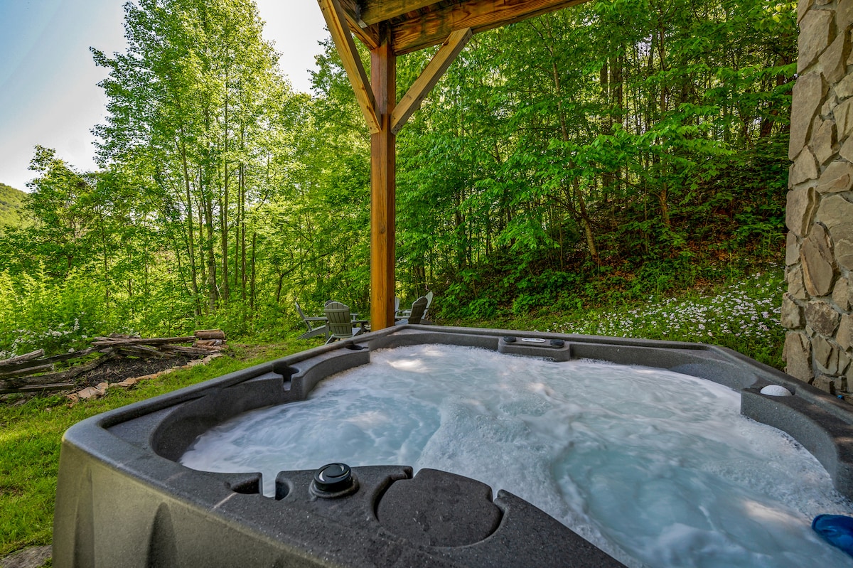 Tucked away on a quiet country road in Almond near Bryson City, this cozy creekside cabin rests on 9 peaceful acres with a babbling brook just steps away. Soak in the hot tub, relax by the firepit, and enjoy a private deck, tiled shower, small kitchen, and washer/dryer. Pet friendly and perfect for a romantic escape. Minutes to NOC, Tsali biking trails, Great Smoky Mountains National Park, the Great Smoky Mountain Railroad, the Tail of the Dragon, hiking, kayaking, and scenic mountain drives.