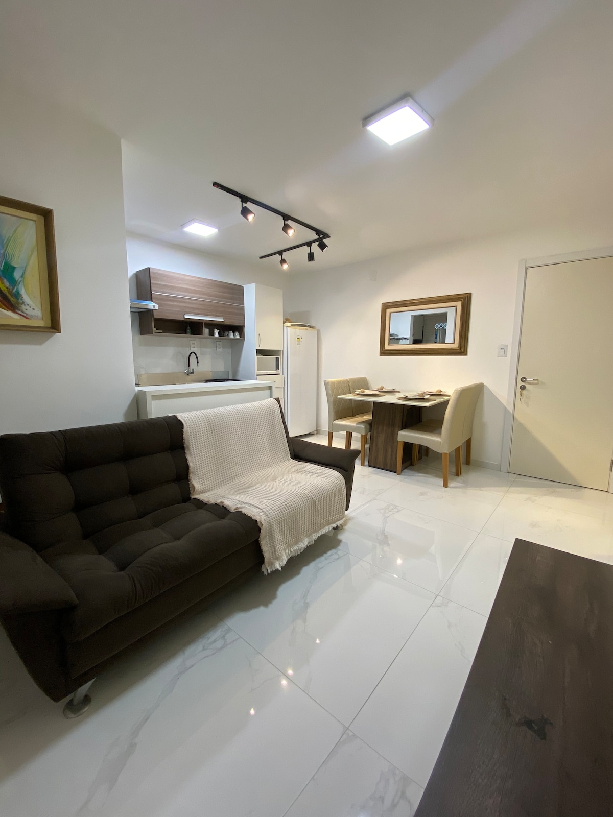 O apto tem um quarto Tipo Estúdio, com Cama Quem, na sala um sofá cama e deixo um colchão avulso, Ele é ideal para Casal com filhos, Cozinha com fogão de indução c 2 bocas, equipado com todos os utensílios Ar condicionado quente e frio no quarto, mas ele aquece ou refrigera o apto tdo, Forneço roupa de cama e Banho, cobertores, O PRÉDIO TEM UMA BOA VAGA DE GARAGEM INCLUSA DENTRO DO PRÉDIO A voltagem da energia em SC é 220vtS