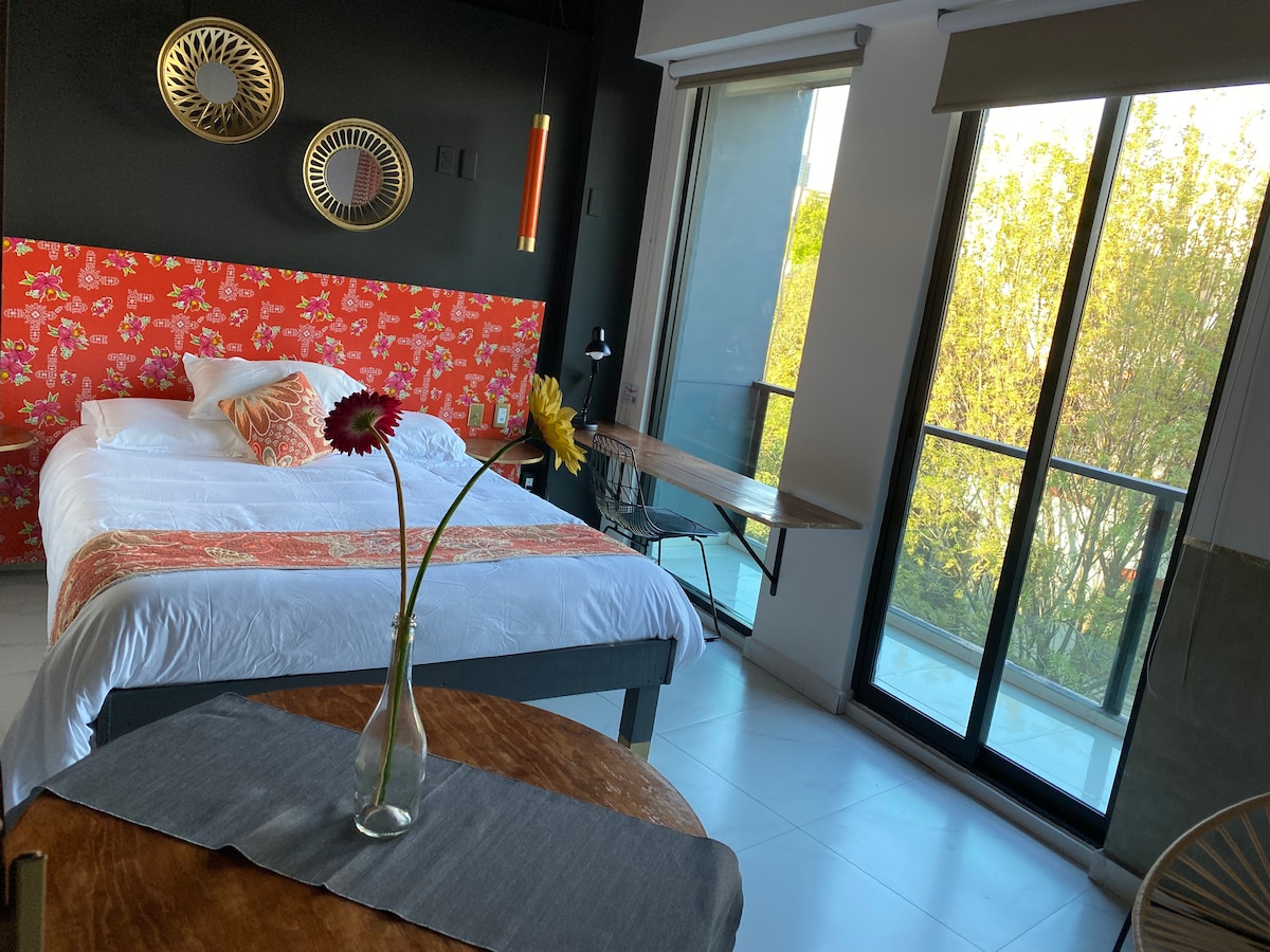 Disfruta de este maravilloso apartamento de 1 dormitorio: * Impresionante horizonte panorámico con vistas panorámicas * Único * Mejor ubicación en México. * Super seguro + Muchos restaurantes + cafeterías + tiendas y más * Los mejores servicios * Conserje las 24 horas del día, 7 días a la semana, en el vestíb * Wifi super rápido y muy confiable * Cómodo espacio de trabajo dedicado * Cocina totalmente equipada * Cama de dos plazas con colchón de espuma viscoelástica europea. * Bien pensado y espacio súper cómodo * Lleno de plantas * Esparce limpio y desinfectado * Espacioso * Lleno de magia