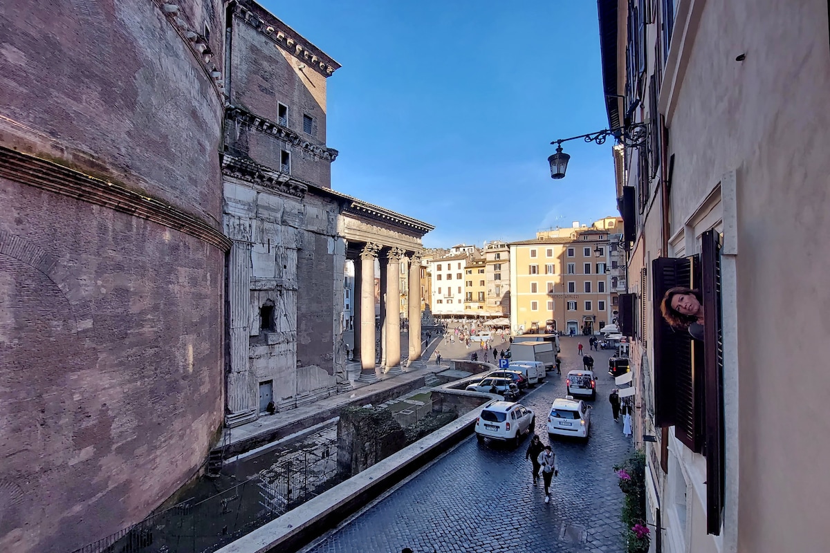 Exclusivo y acogedor apartamento para uso turístico con impresionantes vistas frontales del icónico Panteón, antiguos templos de dioses y emperadores romanos. El apartamento de 100 metros cuadrados es un refugio romántico adornado con vigas de madera que realzan su encanto histórico en el sofá en la sala de estar con 3 ventanas francesas (balcón de Julieta), con vistas a las columnas del Panteón. Aquí puedes relajarte mientras bebes una taza de té o una copa de vino admirando el Panteón como si estuviera al alcance de tu mano. Completamente renovado en 2025.