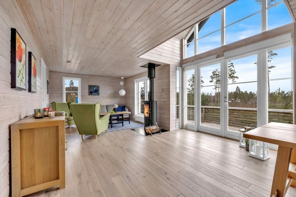 🏡 Cabaña de 70 m² junto a un hermoso lago con impresionantes vistas al mar para un máximo de 6 personas A 45 minutos de Oslo en auto/autobús. Disponible todo el año, ideal para actividades y pesca Playa y parque infantil 2 dormitorios + loft = 3 camas dobles Gran terraza con barbacoa de gas Jacuzzi con 38° todo el año, incluido Estacionamiento gratuito cercano. Carga (adicional) Barco eléctrico (adicional) Aire acondicionado y calefacción Wifi Sistema de sonido Gran proyector con servicios de streaming Cocina totalmente equipada. Lavadora / secadora Sábanas, sábanas y toallas