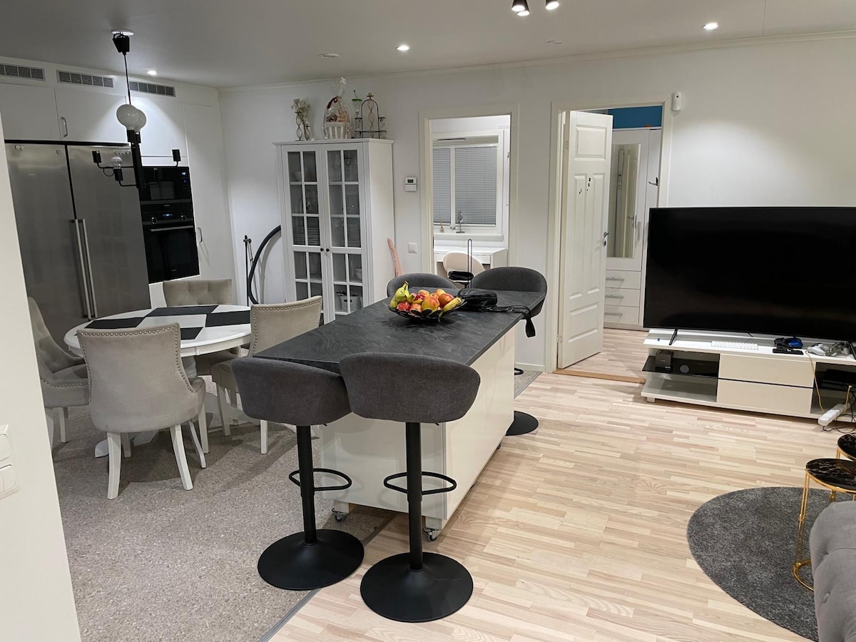 4 dormitorios, 2 baños, lavandería, jardín privado, terraza, barbacoa. Totalmente equipado; lavavajillas, wifi, TV. Cerca de Visby Sommarland Kneippbyn y reserva natural con playa. En el piso superior hay un trastero separado con entrada propia, que no está incluida(se puede alquilar por separado). El edificio del ala no está incluido. Nuestra casa se presta unas semanas (mientras estamos en la cabaña) como autoservicio. Vienes y te vas con cerraduras con código. Tómalo como tu propio hogar mientras lo pides prestado. Hay almohadas y edredones. Trae tus propias sábanas y toallas.