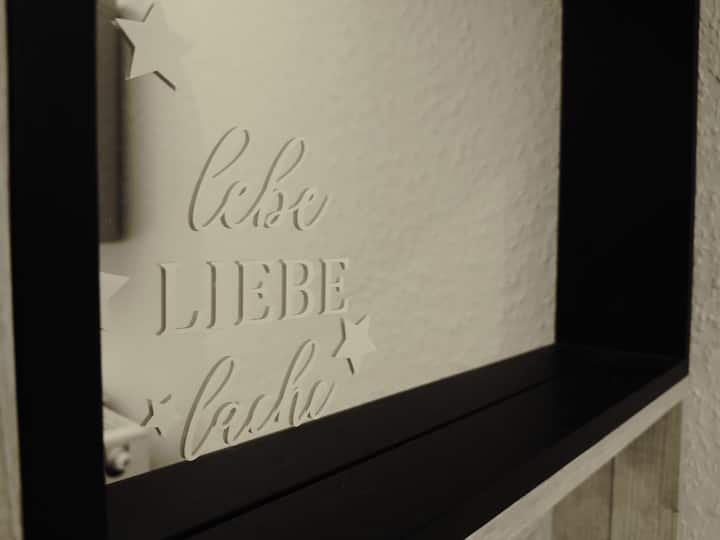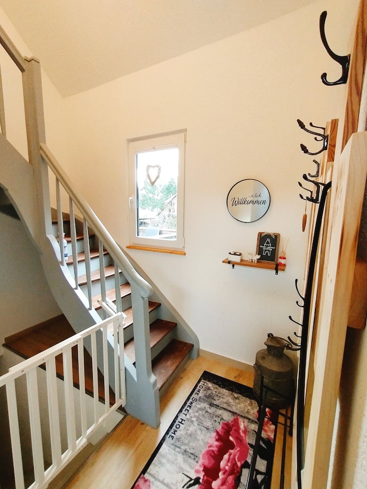 Nuestro piso de 120 metros cuadrados está ubicado en el piso superior y superior de nuestra casa de dos familias amorosamente renovada. Las salas de estar están ubicadas en las antiguas instalaciones de un fabricante de bolsas de cuero de alrededor de 1900. Nuestro paraíso se encuentra en el borde del pintoresco centro de la ciudad de Herrstein.