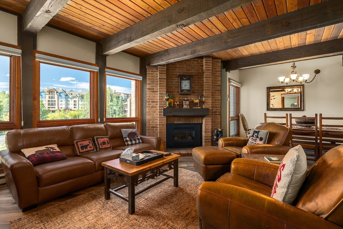 Ski condo only 5 minutes ride to ski mountain on free bus at condo complex and short drive to downtown. Hot tub out back door! King bed in private bedroom. Updated bathroom 2025 and new flooring throughout condo. -Full size, well stocked kitchen with regular & Keurig Coffee -Living room with New Gas Fireplace, leather reclining sofa, 50 inch TV, high spd WiFi, cable and streaming (Netflix, Amazon Prime, HBO Max). -Washer/Dryer in unit -Free Bus Stop: short walk from condo door -Ski Locker