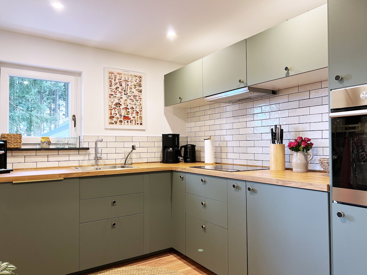 ¡Relájate en nuestro alojamiento especial y tranquilo! El apartamento recién amueblado para un máximo de 4 personas con aprox. 60 metros cuadrados se distribuye en dos plantas. A destacar una cocina totalmente equipada, TV, sofá cama, grandes ventanas panorámicas, una acogedora cama con somier, la terraza privada con asientos al aire libre, así como suficiente estacionamiento para clientes. La ventana panorámica del alojamiento vacacional está orientada hacia el amanecer y el bosque. ¡Nos vemos pronto!