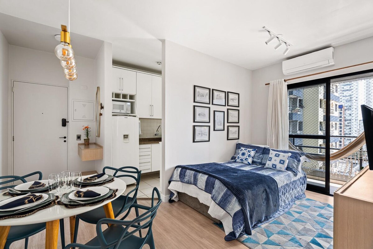 Cocina funcional y acogedora, equipada con cocina de inducción, microondas, ducha y grifos con calefacción. Máquina de café. Cama doble y TV. Ideal para home-office, con espacio dedicado. El edificio ofrece una piscina en el último piso para relajarse. Gimnasio. Aparcamiento de bicicletas. Cerradura con contraseña. El espacio tiene balcón y se encuentra cerca de Itaú CEIC y el edificio Aço. A 300 metros del metro Conceição y a 10 minutos del aeropuerto de Congonhas.