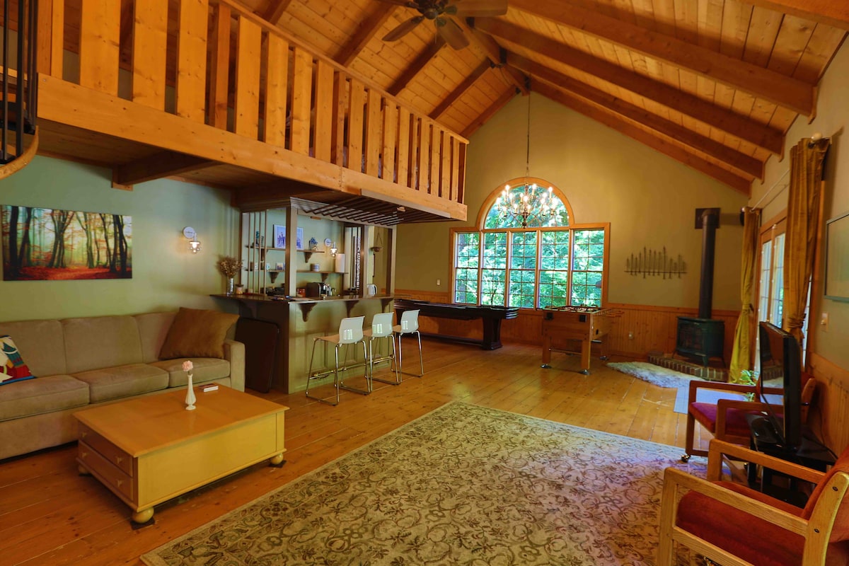 Bienvenido a The Cedar House, una casa de huéspedes tipo estudio independiente de nuestra casa principal. Tendrás entrada independiente y baño privado. Los suelos y techos de madera y los bosques que se ven a través de las ventanas le dan la sensación de una cabaña. La cama tamaño queen está en el loft y debes poder usar las escaleras para llegar a ella. Hay un sofá cama tamaño queen en el nivel principal para dormir más. Previa solicitud, hay disponibles 4 colchones de aire individuales adicionales y ropa de cama. Hay espacio disponible para un corralito de bebé.