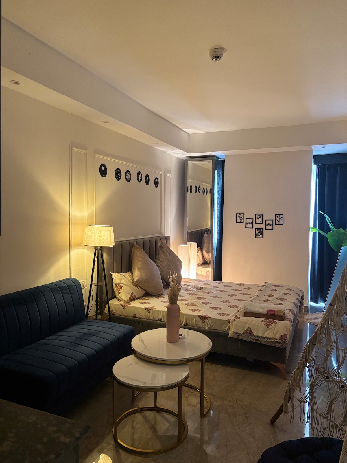 Bienvenido a la Suite 622, un Airbnb único con estilo SOHO (Small Office/Home Office) con un toque de estilo londinense, en el bullicioso cruce de 8 carriles de Tricity Chandigarh. Toma tu Starbucks, compra en Uniqlo o Decathlon, come en McDonald's Burger o Burger King, situado justo al otro lado de la calle. ¡Ideal para fines de semana juveniles, guerreros que trabajan desde casa y parejas a las que les encanta la buena onda! Vives en el sexto piso de la majestuosa Mayagarden Magnesia. Disfruta de las instalaciones del famoso Romeo Lane Club.