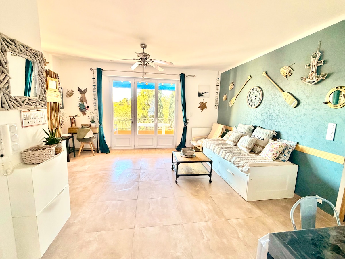 Con una ubicación ideal, a poca distancia a pie de la playa, el puerto y las tiendas. Apartamento en el 1.º piso de una residencia arbolada tranquila orientada al sur totalmente equipado (lavadora, aire acondicionado, horno, TV, wifi, cafetera Tassimo, plancha...). El alojamiento consta de una sala principal con cocina americana, todo ello con vistas a un balcón de 10 m². Una zona de dormitorio cerrada con 2 camas individuales, el salón cuenta con un sofá cama de 2 plazas. Cuarto de baño. Residencia segura con aparcamiento.