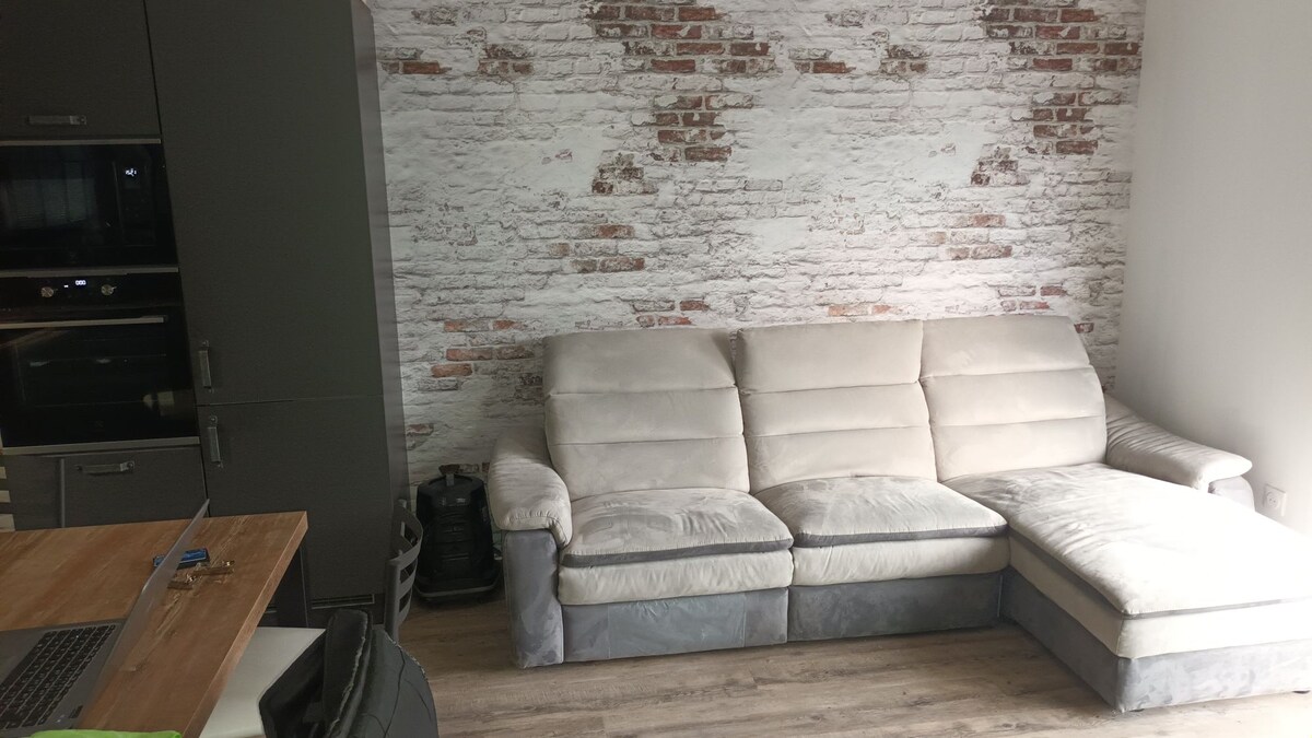 Moderno apartamento que consta de una cocina equipada con lavadora y lavavajillas. Máquina de café de la marca "SENSEO". Sala de estar con sofá y televisión conectada, una mesa y dos sillas para comer cómodamente. Cuarto de baño con inodoro, gel de ducha y champú, así como toda la ropa de cama y secador de pelo. Hermosa zona de noche con cama de matrimonio 140x200 y armarios empotrados. Se beneficiará de wifi gratuito. El estacionamiento PRIVADO está INCLUIDO en su reserva.