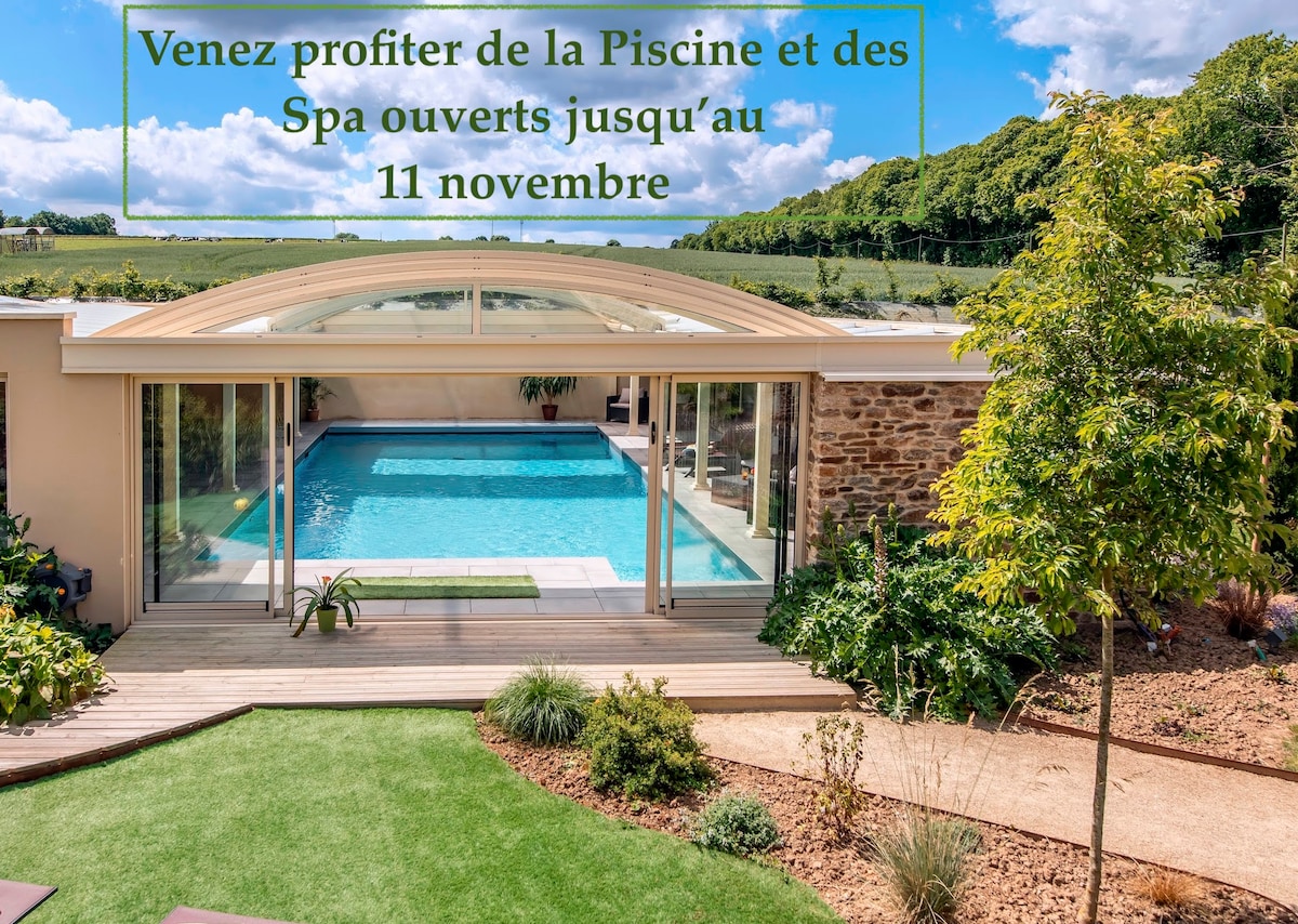 La antigua granja, con un carácter típicamente bretón, ha sido completamente renovada por nosotros, combinando autenticidad y modernidad. El edificio se abastece con energías renovables. De marzo a noviembre, para compartir con otros viajeros, una gran piscina climatizada y cubierta (220 m²) y dos spas (accesibles a partir de 12 años) te permiten relajarte de forma gratuita, a tu conveniencia. Servicio de masajes bajo petición.