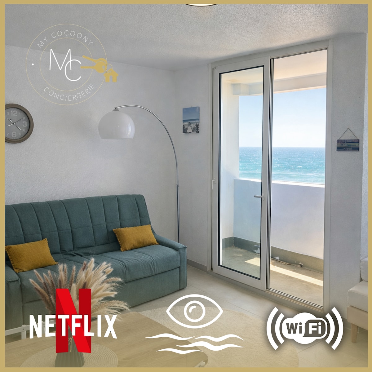 Vue panoramique exceptionnelle sur l'océan depuis l'espace repas, le salon, la cuisine, la chambre. Pas besoin de sortir de l'appartement pour admirer les magnifiques couchers de soleil. Refait complètement à neuf en 2022, il bénéficie d'une décoration moderne et soignée, d'un grand confort, et d'équipements haut de gamme. Situé au dernier étage avec ascenseur, vous pourrez profiter de la plage, du snack bar et du terrain de pétanque juste devant. Attractions les plus prisées et services à pieds