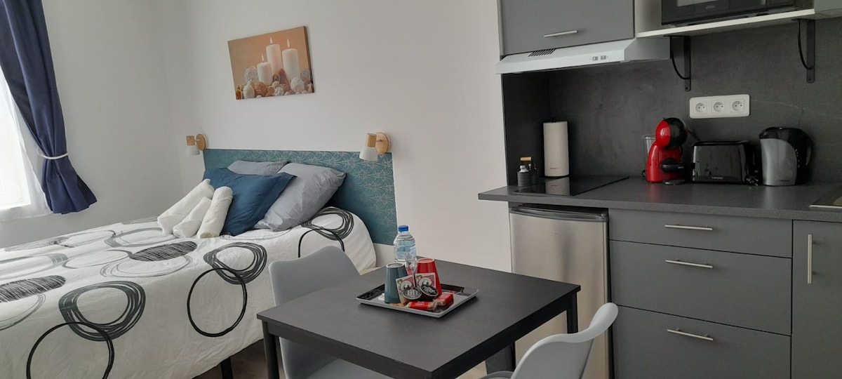 Situado en el segundo piso de una residencia privada, a 800 metros de la estación de tren y del centro de la ciudad, este estudio con todas las comodidades es lo que necesita. ¿Viene por una misión, para visitar, para ver a la familia? Nuestro estudio nido le seducirá por su lado práctico y su ubicación. Un servicio de «self-check-in» le permitirá acceder a este alojamiento en el segundo piso, con total autonomía y a la hora que desee.