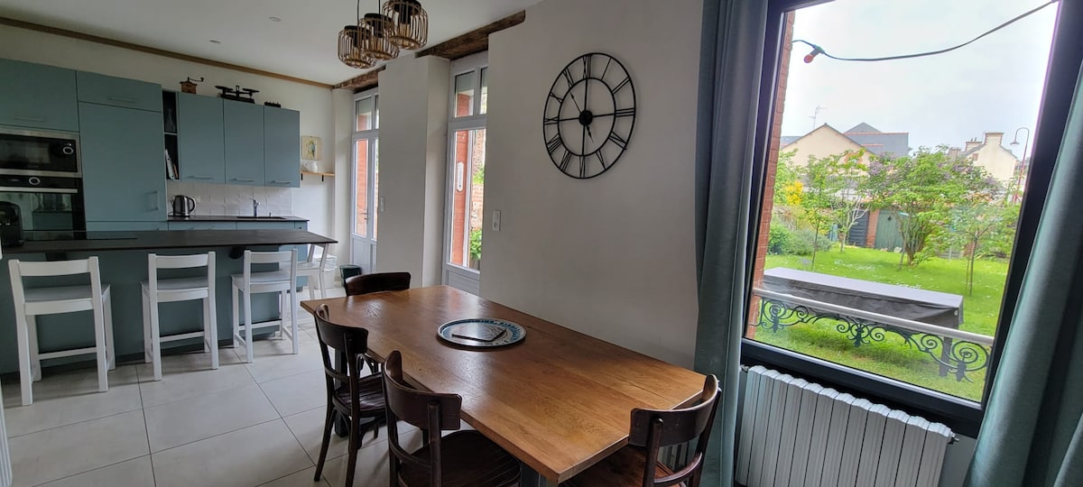 Bienvenido a nuestra casa del centro de la ciudad cerca del mar con todas las tiendas cerca. Equipado con una suite principal con su ducha italiana,otro dormitorio con dos camas dobles y una cama individual, una ducha italiana en la planta baja. Estacionamiento gratuito al final de nuestro callejón. 2 bicicletas para adultos y 1 bicicleta para niños a partir de 8 años están disponibles. Tendrá a su disposición papel higiénico y un juego de toallas de baño de primera necesidad. Se proporcionan sábanas