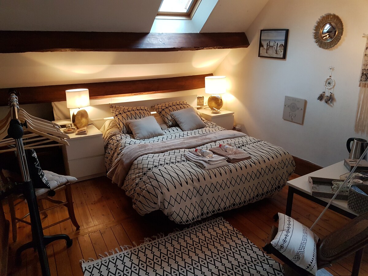 Chambre d'hôte avec salle de douche et WC. Literie de 160. Télévision dans la chambre Mise à disposition d'une bouilloire, d'une cafetière, de thé +café. Petit réfrigérateur. Terrasse arborée avec table et chaises. Accès WI-FI.