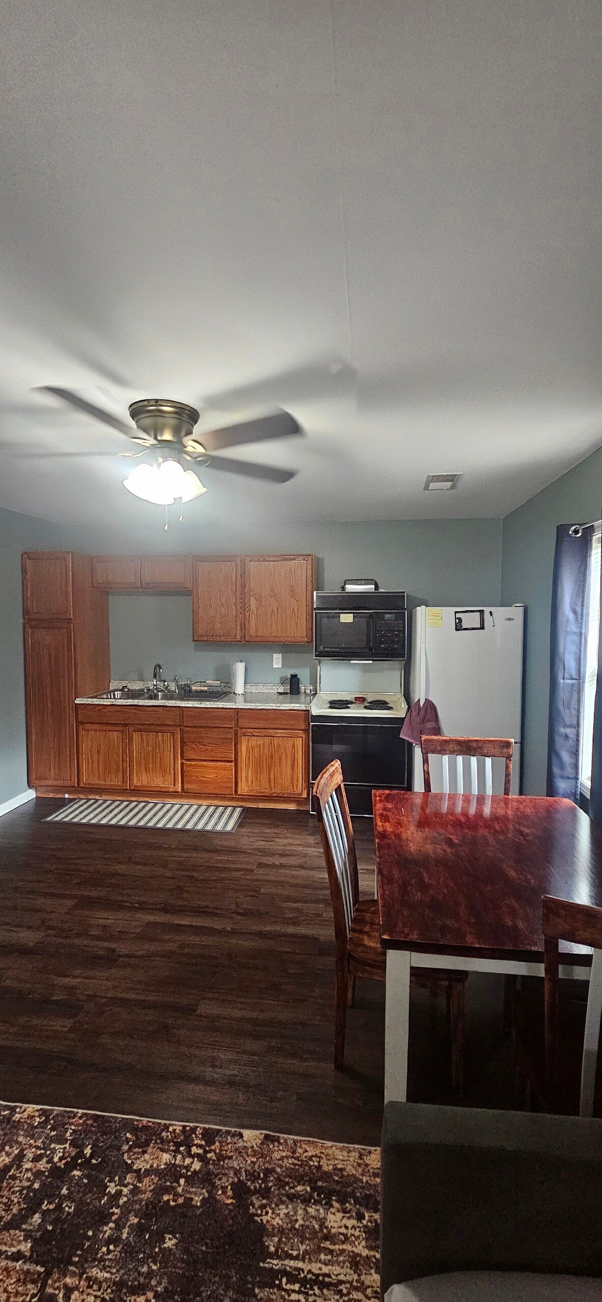 La habitación es una eficiencia independiente con una pequeña cocina, cortinas opacas y cama tamaño queen reclinable. Tiene una plaza de aparcamiento designada y entrada independiente. La unidad tiene baño privado, vestidor y cocina americana. También tiene nevera, cafetera, escritorio, microondas, TV inteligente de 42 pulgadas, horno con airfryer Ninja y sofá. Porche privado con mesa y sillas. Plaza de aparcamiento individual cercana/segura.