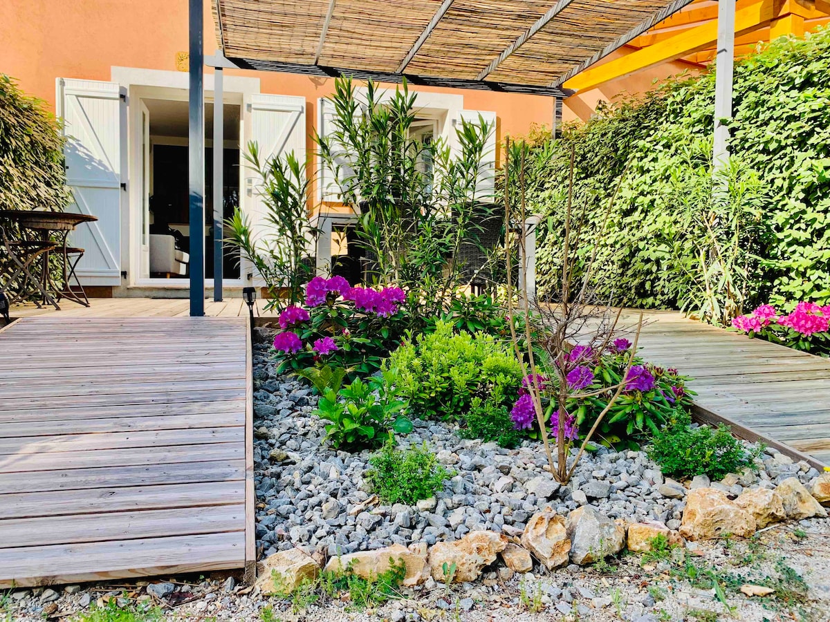 Jolie maison de 65m2, entièrement climatisé, comprenant au RDC: une grande pièce à vivre avec coin cuisine, salon et salle à manger, un wc. A l’étage: 2 chambres dont une avec terrasse, salle de bain et wc séparé. En extérieur, jolie et grand jardin avec PISCINE PRIVÉ(non partagé)transats à disposition. Terrasse abritée avec coin canapés. Table à manger et parasol. Barbecue à charbon. Petite maisonnette d’extérieur pour enfant « à partir » de 3ans. Possibilité d’un bébé en plus des 4voyageurs.