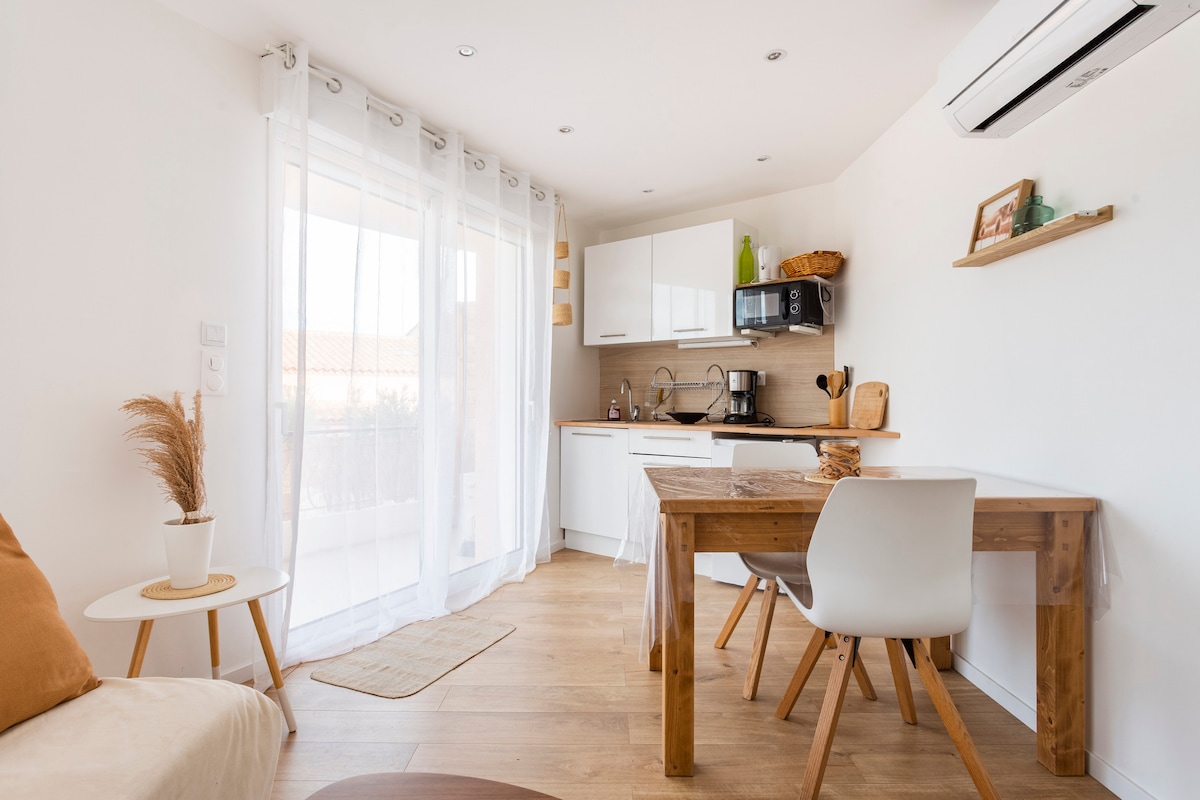 Casa de 42 m² con su jardín privado de 100 m² y 2 terrazas con horno de PIZZA. Una piscina privada de 10 m² climatizada con vistas a la terraza está reservada para usted en el terreno (sin restricciones de horario para el uso), un jardín mediterráneo está presente con palmera, cocotero, limonero, platanero y olivo. La casa tiene una cocina americana completa ( nevera, placa de inducción, hornos, lavavajillas, cafetera tassimo...), una mesa y 4 sillas.