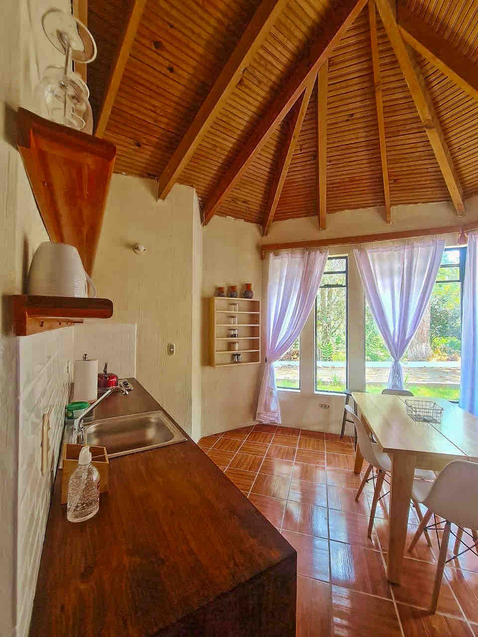 Cabaña con pequeña cocina, comedor y sala ideal para viaje de fin de semana o para vivienda temporal. Senderos y hortalizas son algunas de las atracciones en la finca.
