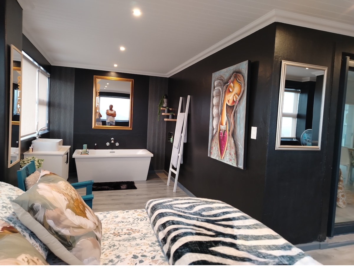 A modern style studio apartment in Langebaan near the crystal clear waters. The apartment features an open plan area with a queen size bed, kitchenette with stove, fast and free Wi-Fi and a 43inch Samsung TV with DSTV. We have built this apartment with functionality and design in mind. The result was a modern studio that provides everything you need for a relaxing and romantic beach holiday in the heart of the West Coast.