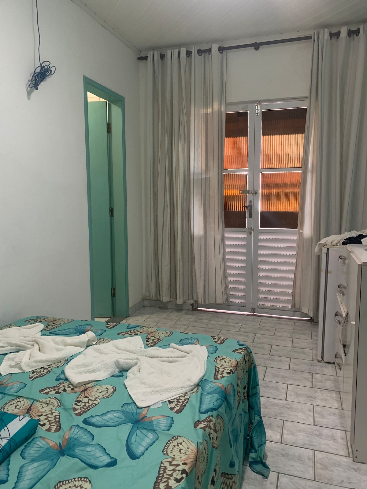 Relaxe com toda a família nesta acomodação tranquila, aconchegante e familiar, disponibilizamos 1 quarto com uma cama de casal, ar condicionado, sala com tv, wi-fi, cobertura com redes, área com churrasqueira, chuveiro externo