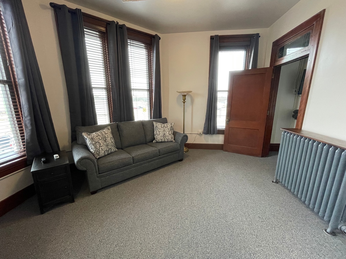 Esta habitación de 2 habitaciones tiene 2 camas tamaño queen en el dormitorio y un sofá cama de tamaño completo en el área común. La suite cuenta con baño privado, mininevera, microondas, microondas, 2 televisores inteligentes con estaciones locales y cafetera Keurig. Ubicado en el edificio histórico recientemente renovado en el centro de Wilber, Nebraska. Está a poca distancia a pie de tiendas, restaurantes, bares y otras atracciones, incluido el Museo, la piscina de la ciudad, etc.