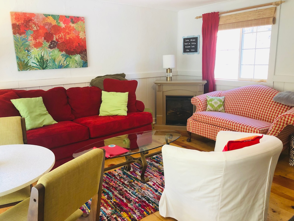 We just gave this cute mountain home a brand new face lift. It's light filled and lovely with new everything inside. It's especially beautiful and cozy in winter, and of course summer is spectacular. There is a full kitchen, laundry, and two full bathrooms, one of which is en suite in the master. The master bed is king size. The bunkroom has two nice, sturdy full-size bunkbeds, so can technically sleep 8, because there are 4 double beds. The living room has a big couch, TV and fire place.